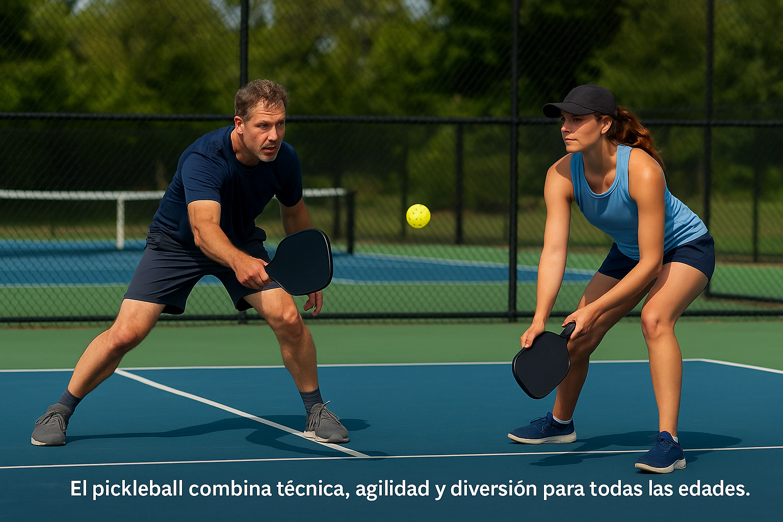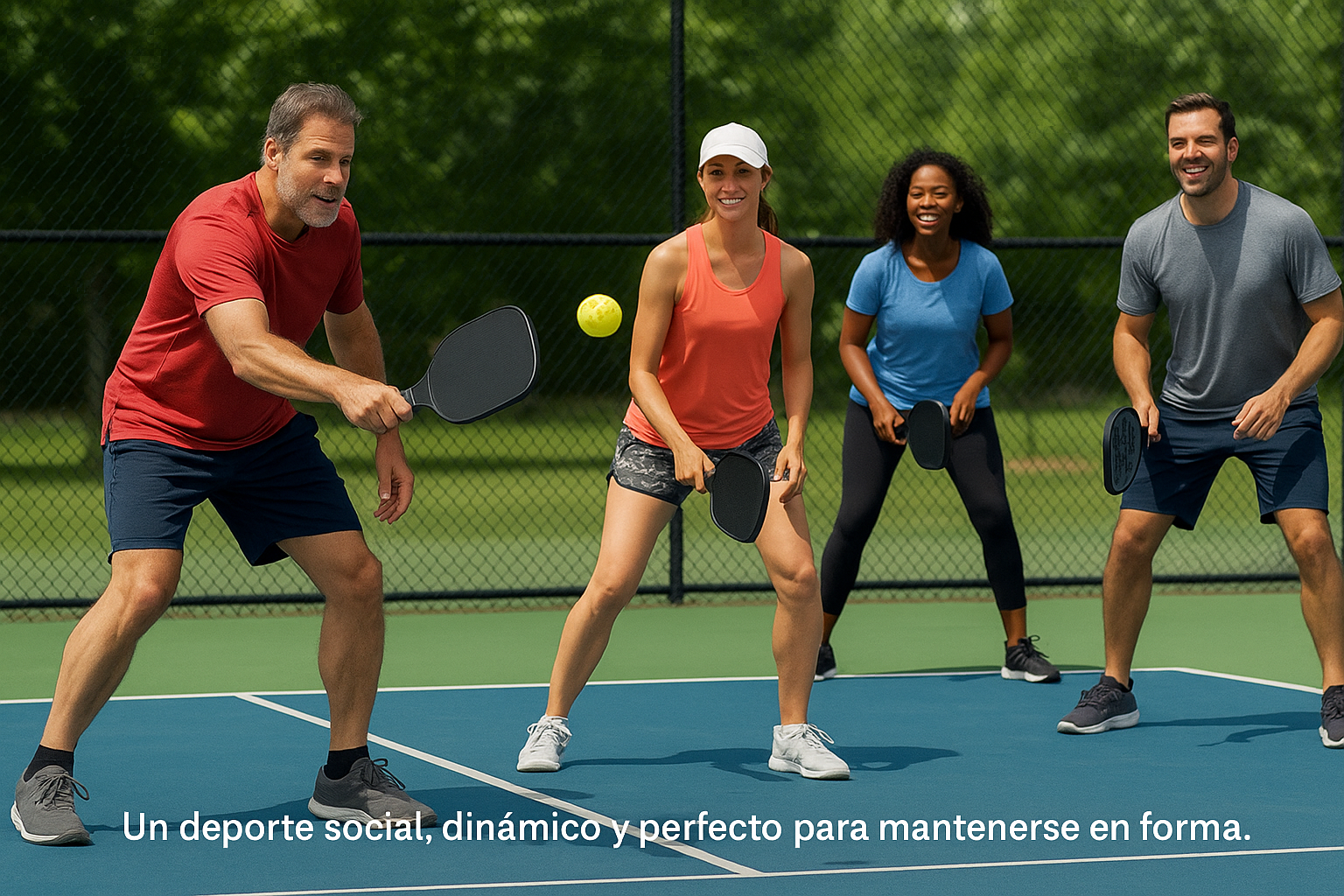 El pickleball es un deporte de raqueta que se juega en una pista similar a la de bádminton, con una red baja y una pala sólida y ligera.