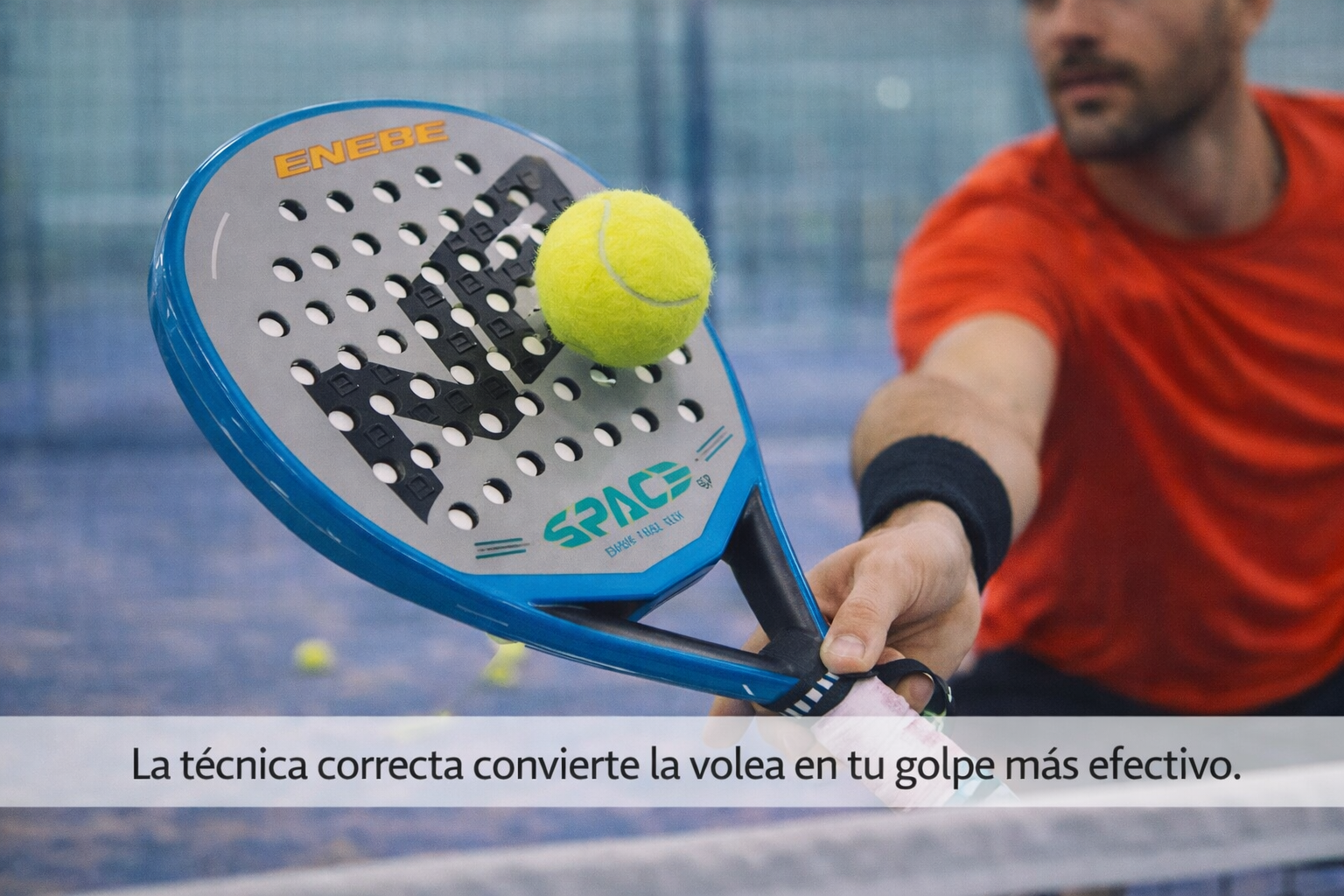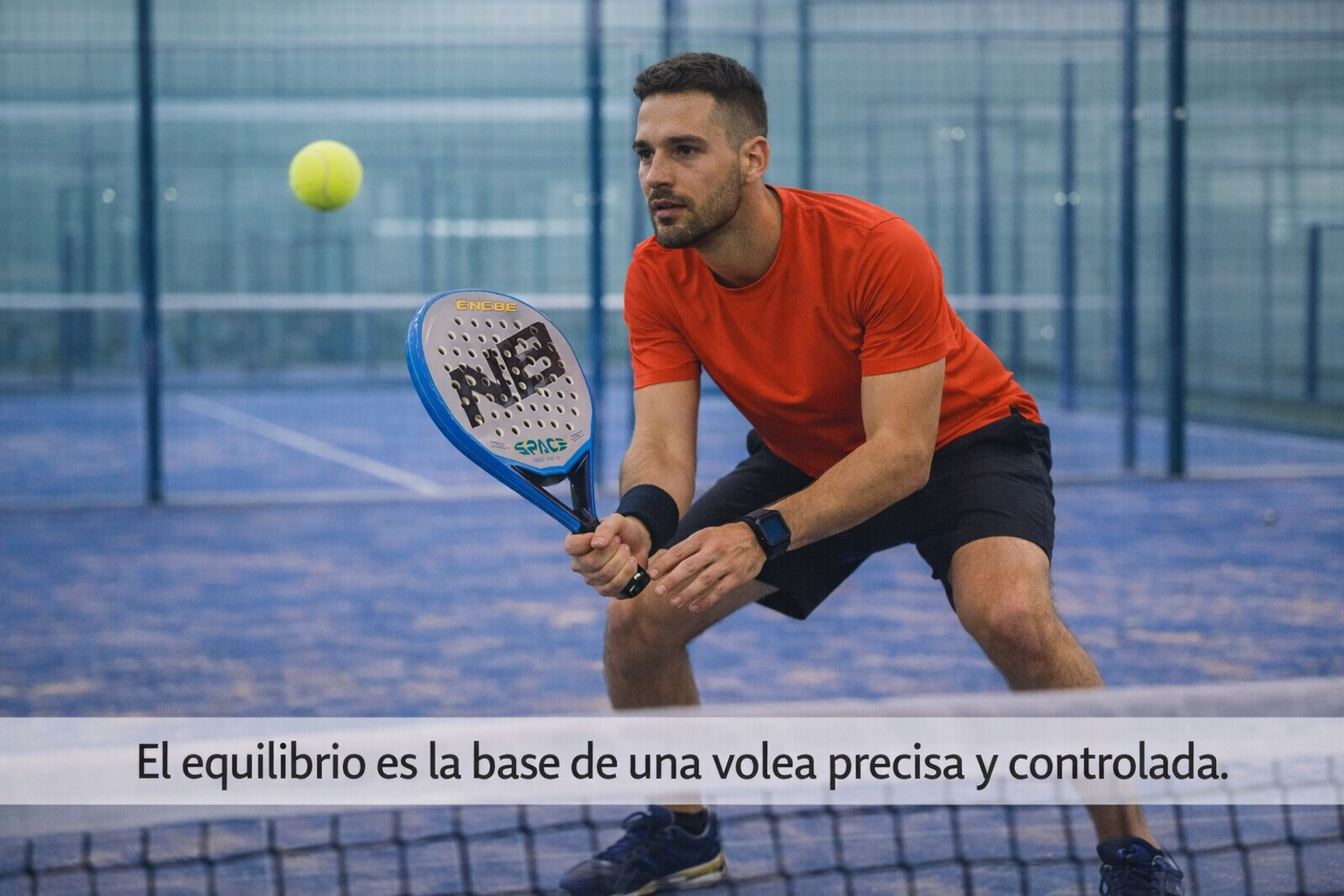 El golpe debe ser corto y controlado, con la pala por delante del cuerpo. Evita movimientos amplios o bruscos: en la volea, menos es mas.